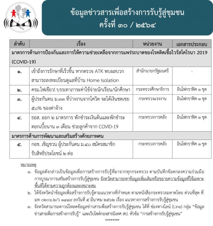กระทรวงมหาดไทยแจ้งข้อมูลข่าวสารเพื่อการรับรู้สู่ชุมชน ครั้งที่ 30/2564